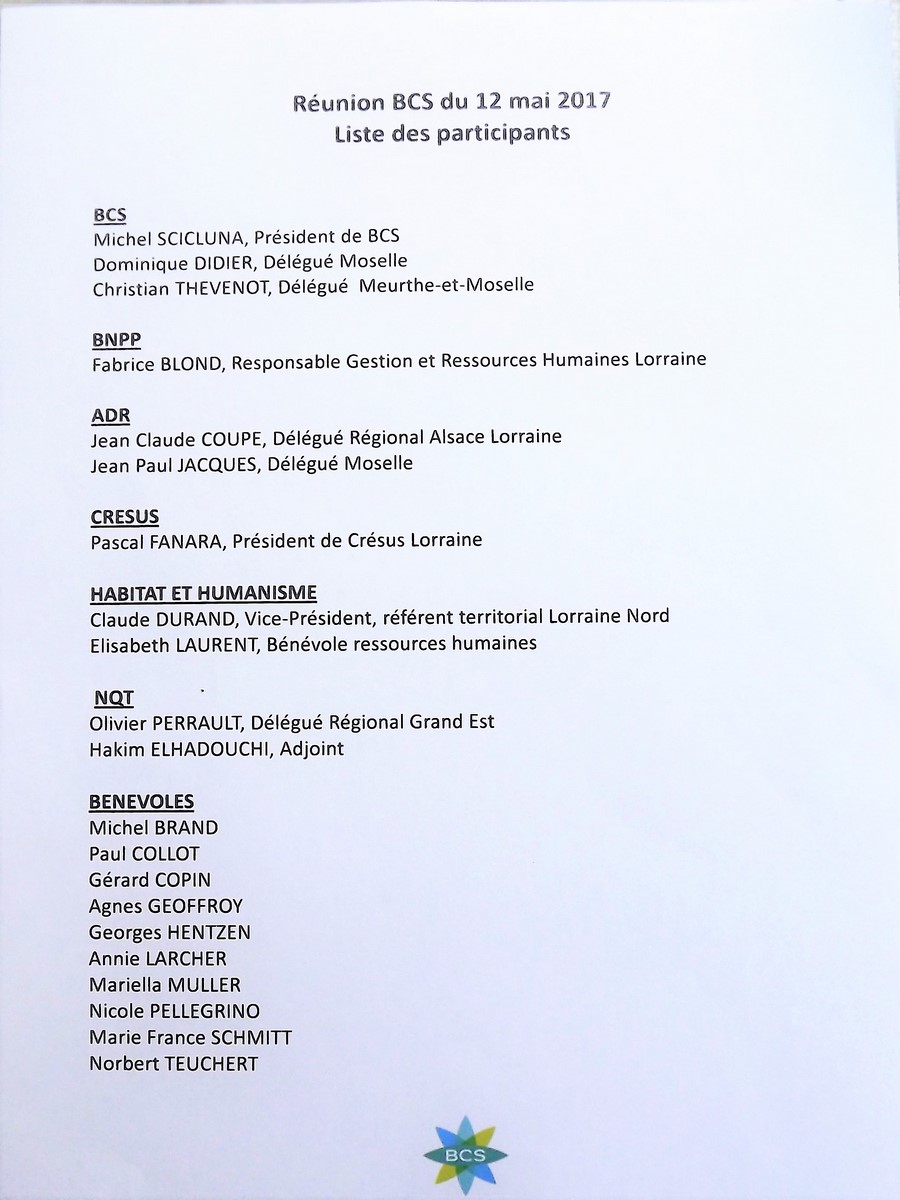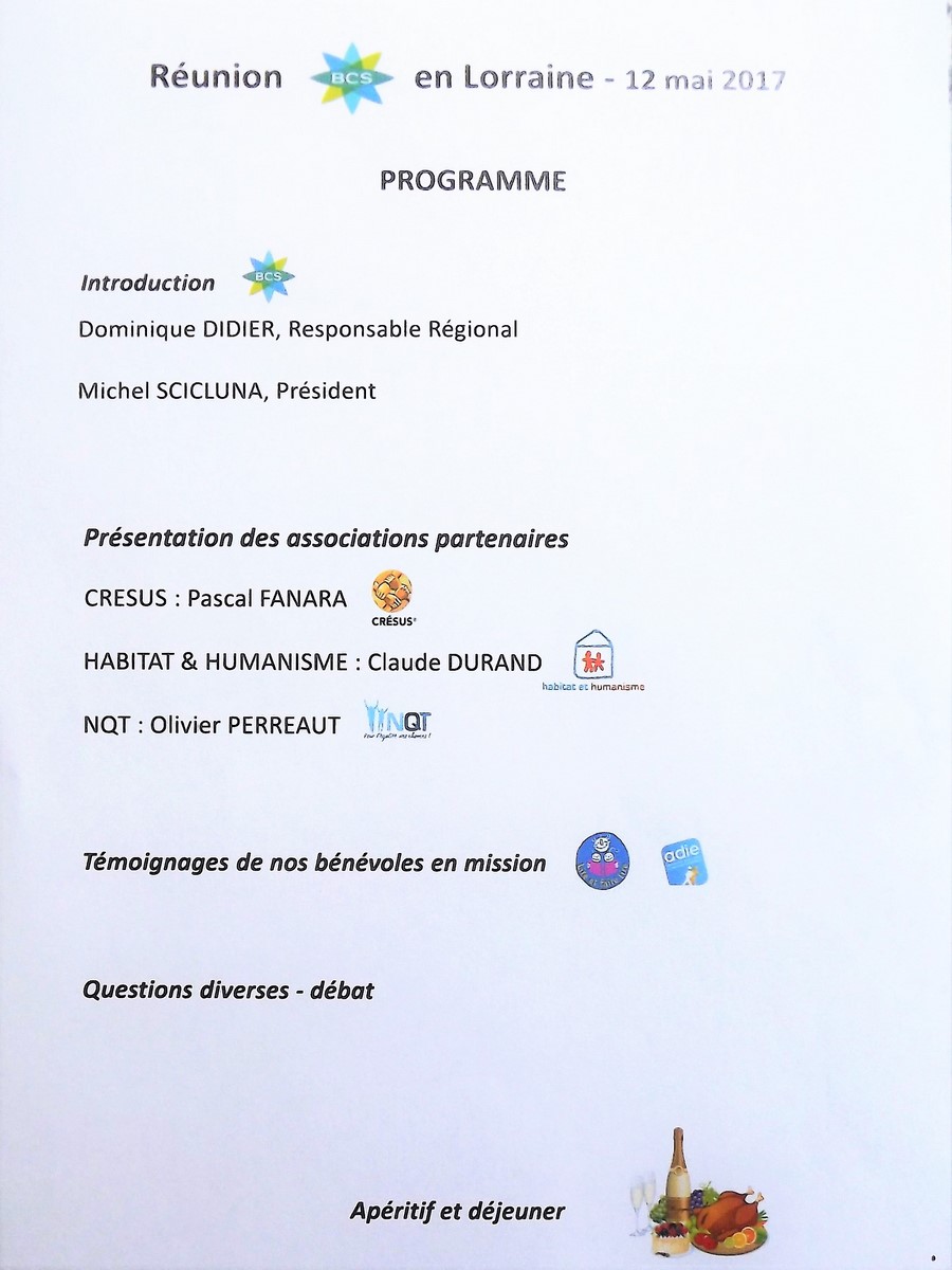 Animée par notre responsable régionale et local, Dominique Didier, notre réunion annuelle 2017 a été rehaussée par la présence de nombreuses personnalités. Michel Scicluna, président national, Jean Claude Coupe, délégué régional ADR, Fabrice Blond, DRHH du groupe Lorraine nous avaient fait l'honneur et le plaisir d'assister à nos ébats. Les associations partenaires étaient également bien représentées. Mais le principal ce cette réunion est de réunir nos bénévoles. Ils étaient dix présents, dont quatre nouveaux sur la vingtaine que compte notre troupe. Toujours riche en information et en échange et surtout très convivial ce moment est un instant privilégié au sein de notre délégation mosellane.