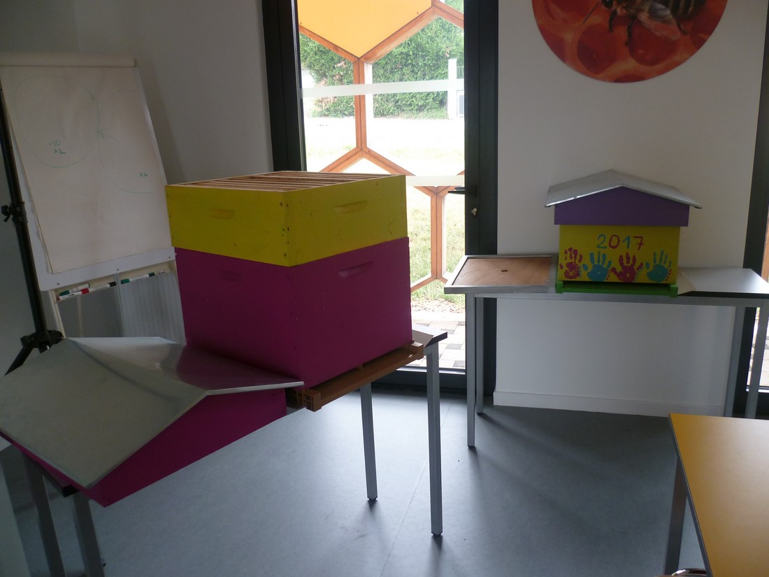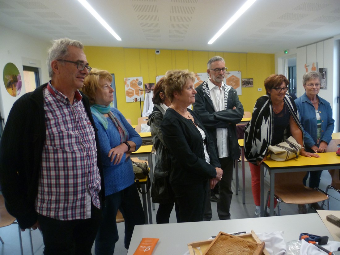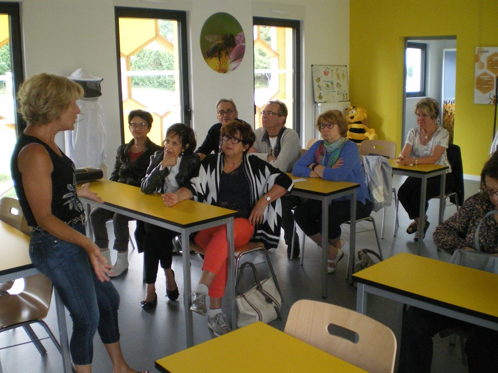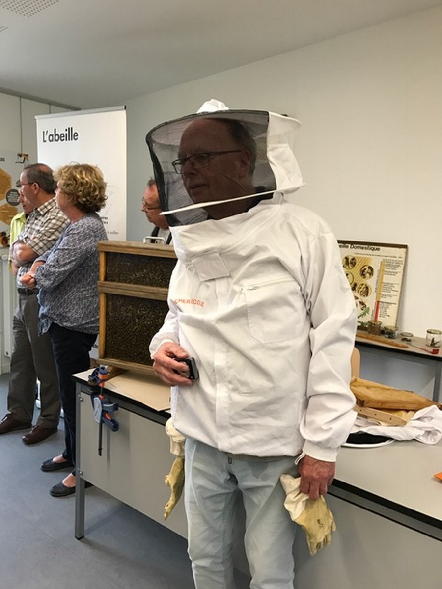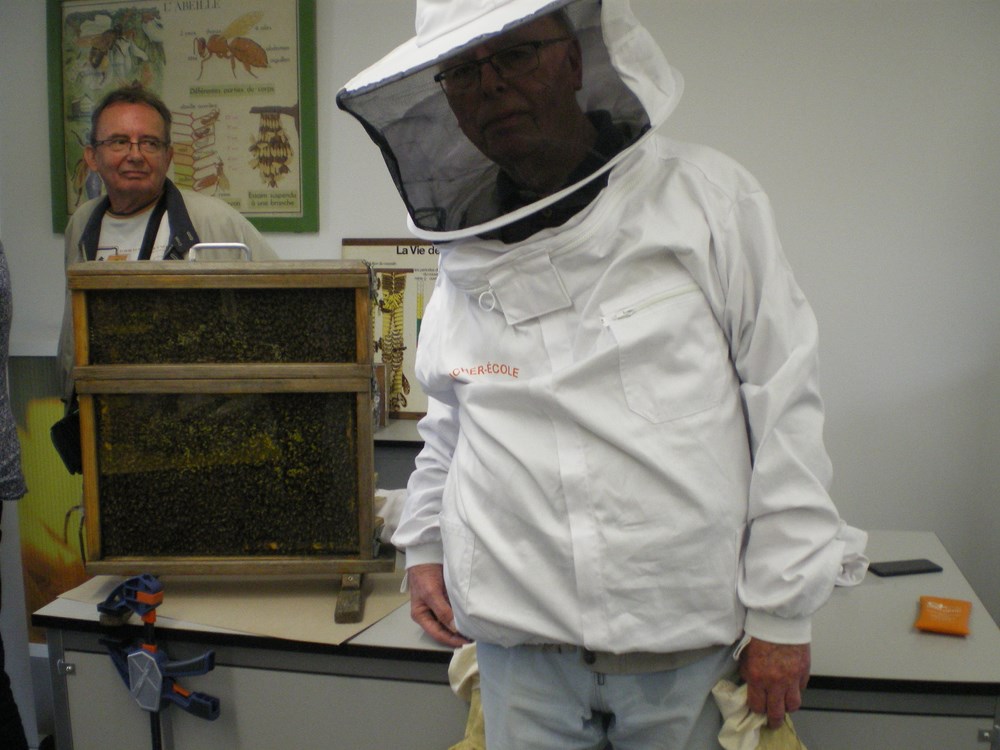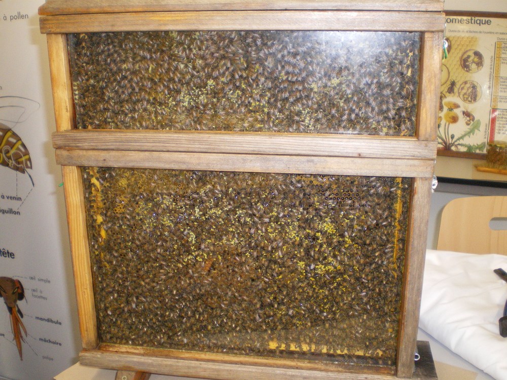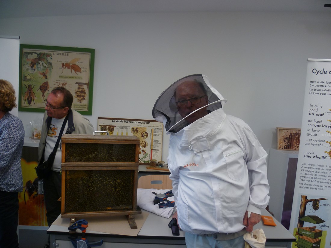 C'est à l'école rucher que nous nous sommes rendu. Une visite guidée par la directrice de l'établissement grande connaisseuse du monde apicole car apicultrice elle-même et remarquable pédagogue. Un monde assez extraordinaire que celui des abeilles. Monde très travailleur où la reine mère pond 2.000 oeufs par jour et ce pendant cinq années, mais un monde très misandrique où le mâle n'a droit qu'à une partie de jambes en l'air ces organes génitaux restant dans la reine mère.