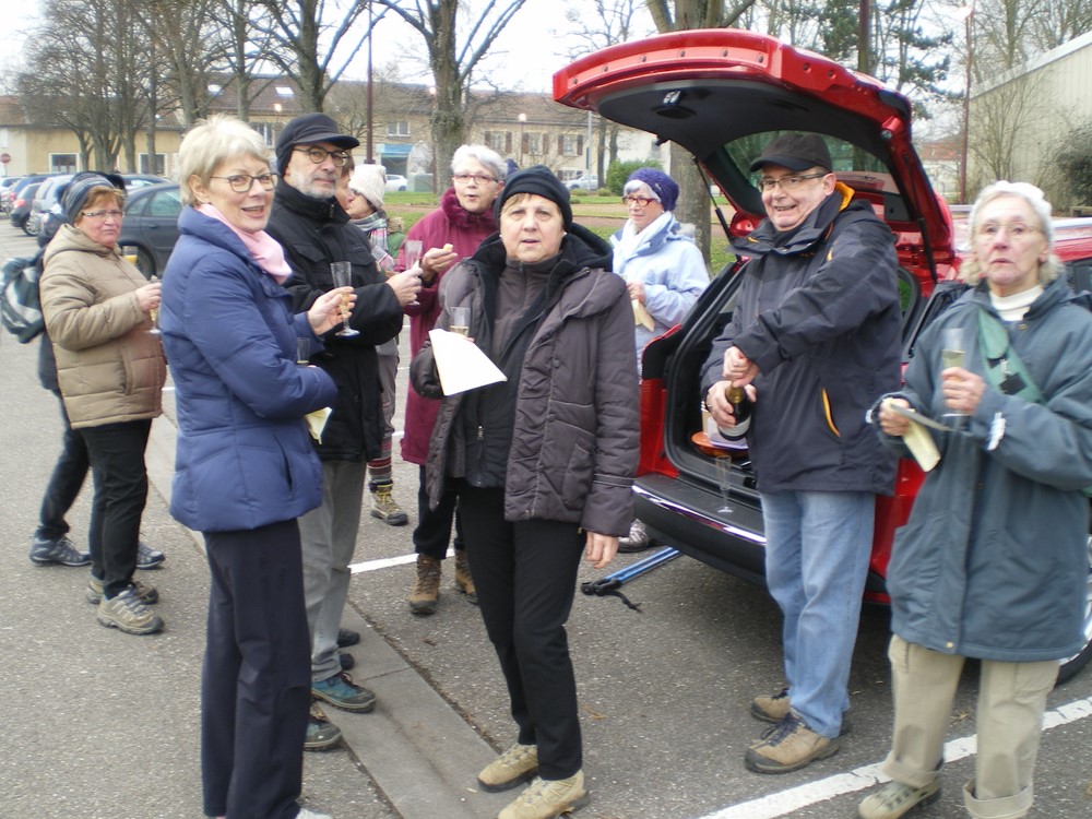 Nous étions quatorze ce jour à arpenter l’ancienne voie ferrée Marly-Château Salins , dite voie verte , avant de célébrer dignement l’anniversaire de Claude S. en même temps que le baptême de la nouvelle voiture de Claude W.