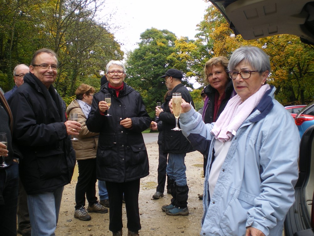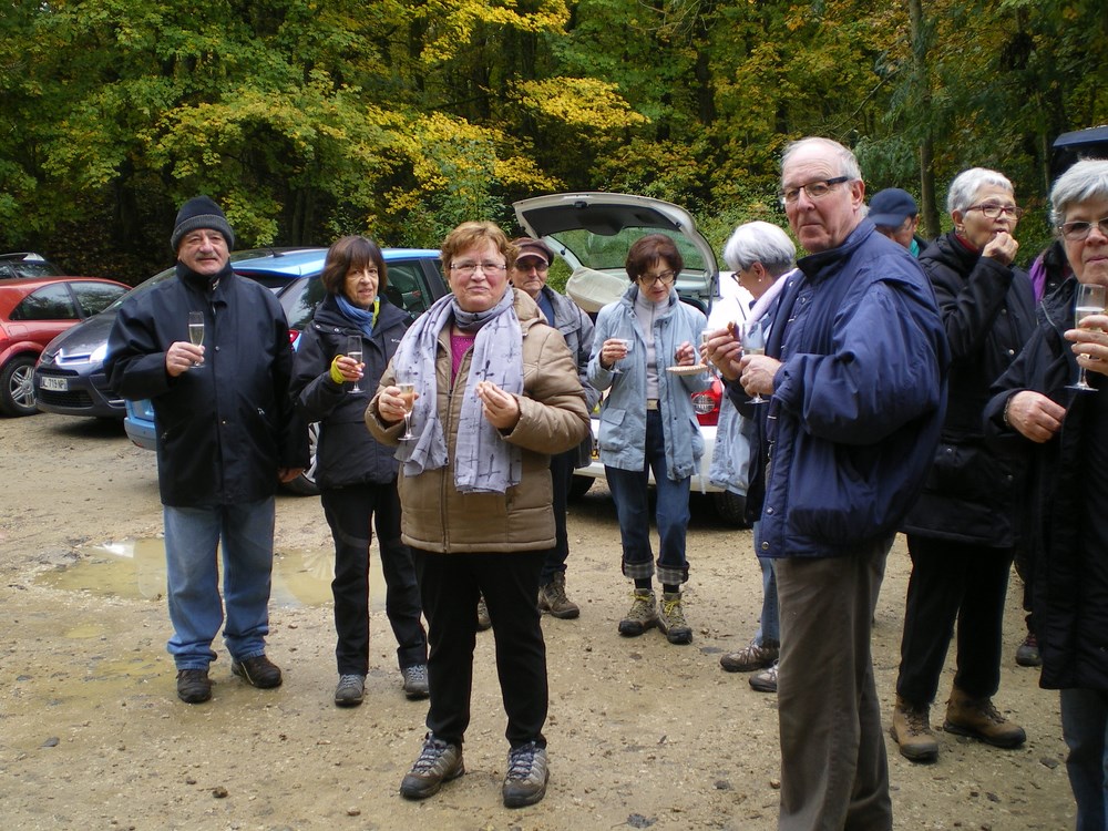 Après la descente du plateau de Lessy vers les vignes de Scy encore embrumées , nous avons découvert une brassée de champignons…mais chacun a préféré les gourmandises arrosées en l’honneur de Josette et Dominique .