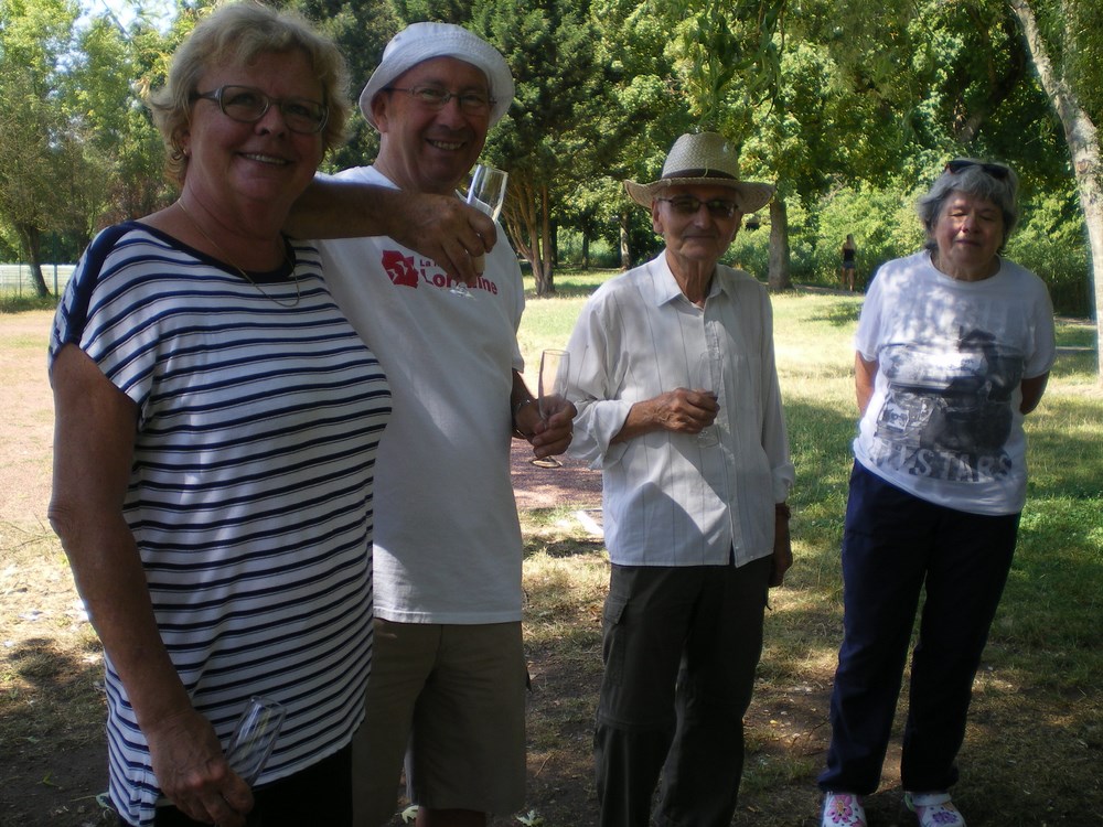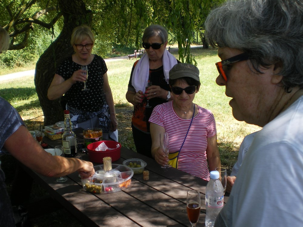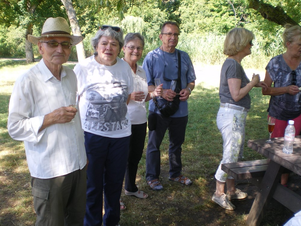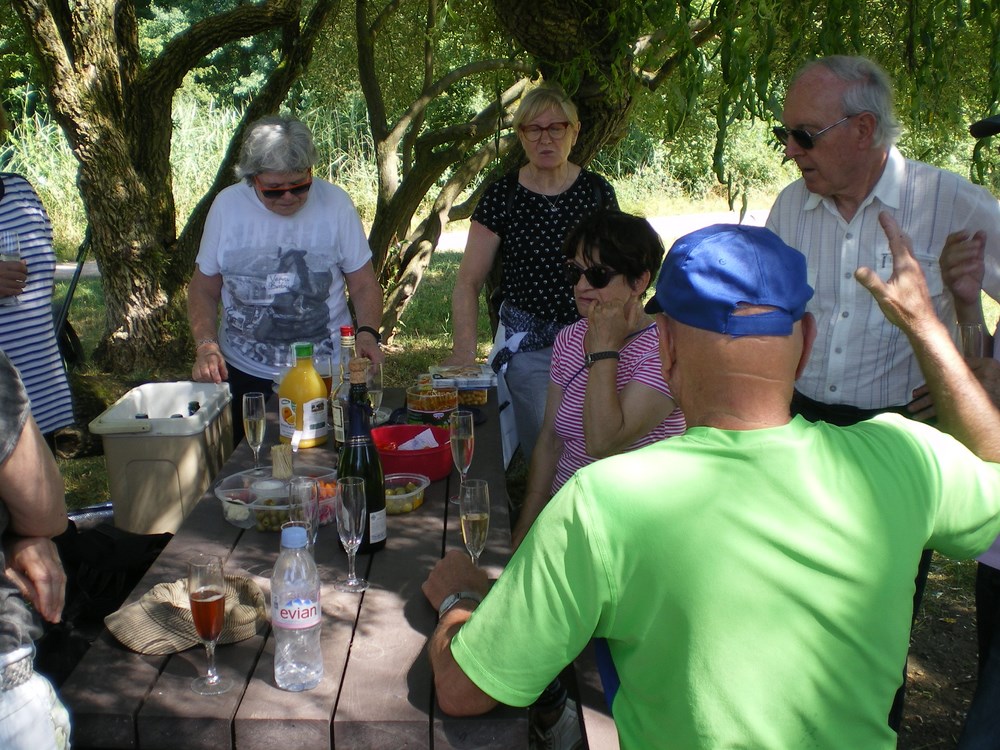 Divine matinée sur les berges du canal de Jouy . Bien abrités des rayons solaires , nous sommes arrivés à l’heure prévue sous la tonnelle où la table était dressée pour fêter Annie et Claude que nous remercions . Avant de nous quitter , nous avons immortalisé nos Claude du jour la tête dans les nuages…