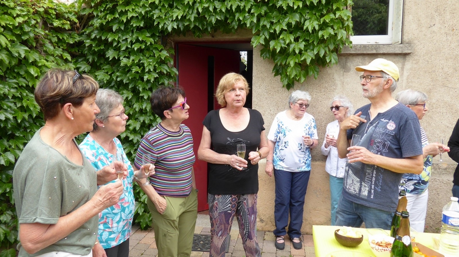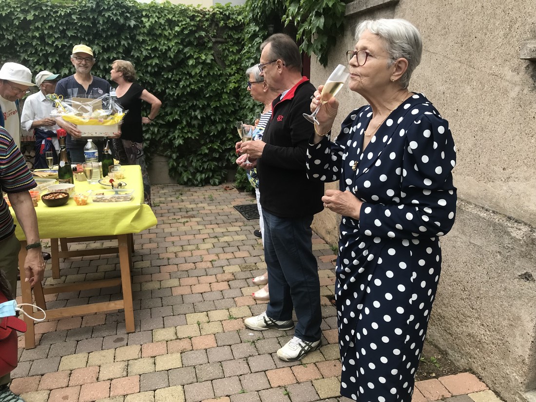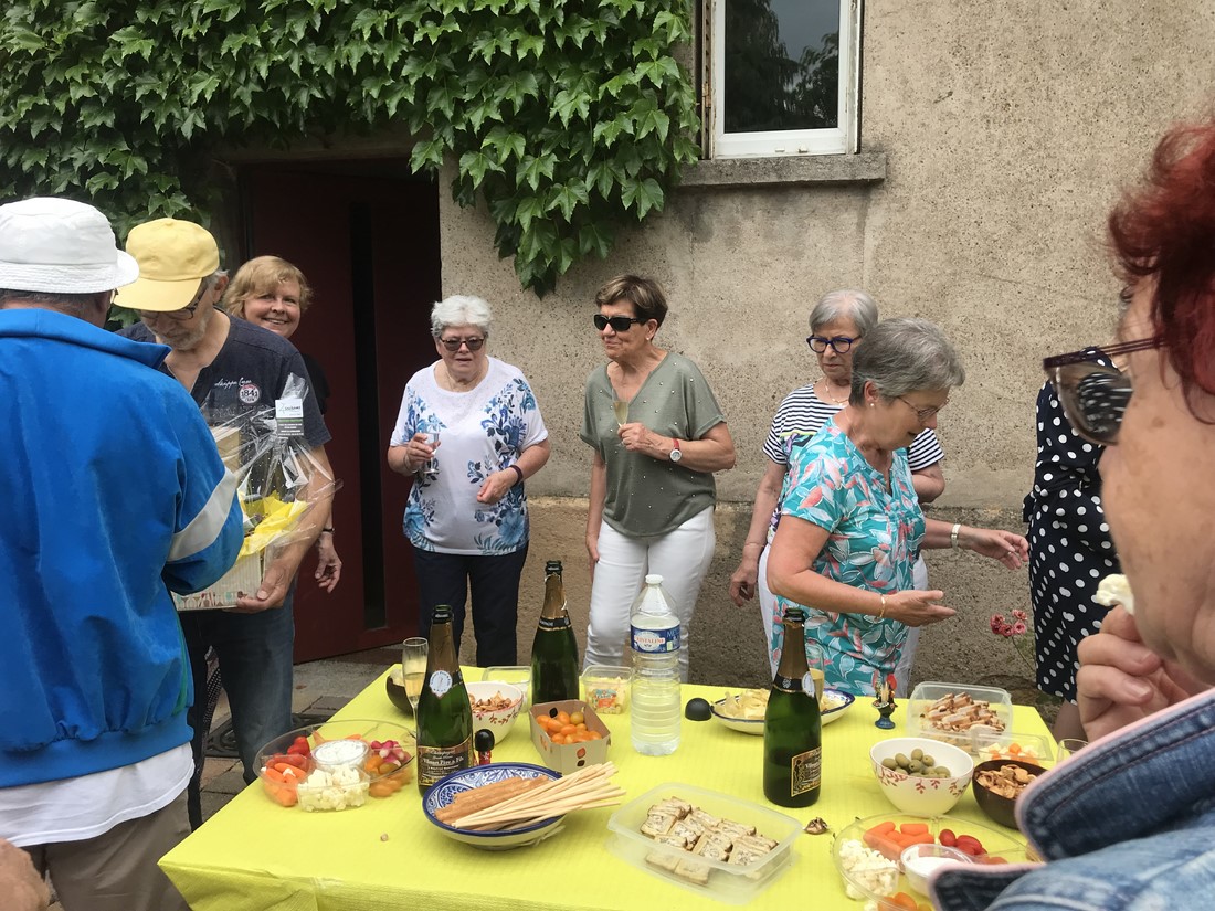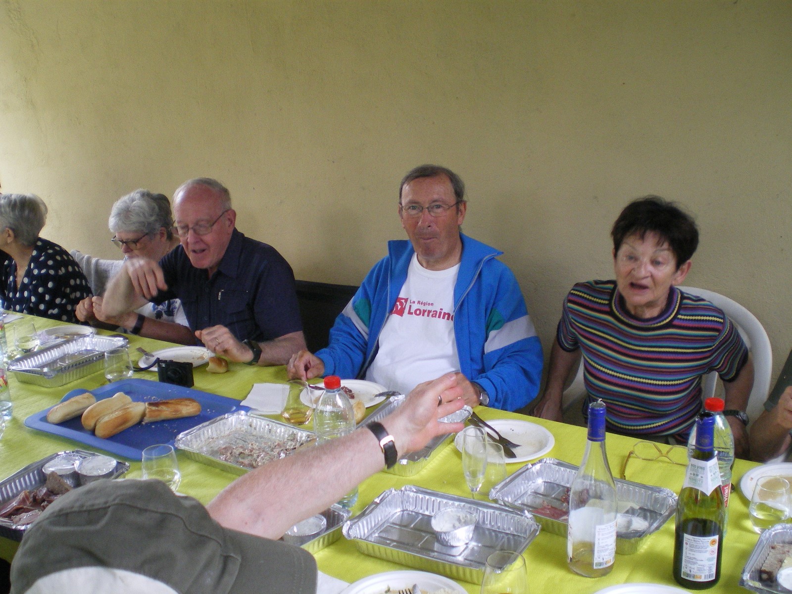 Après un apéritif qui nous a permis de découvrir les talents cachés de Chantal pour ses petits fours , salades , cochonnaille et fromage ont composé le menu arrosé de côtes du Rhône , suivi d’une tarte aux griottes accompagnée du café avec un certain plus pour quelques uns .