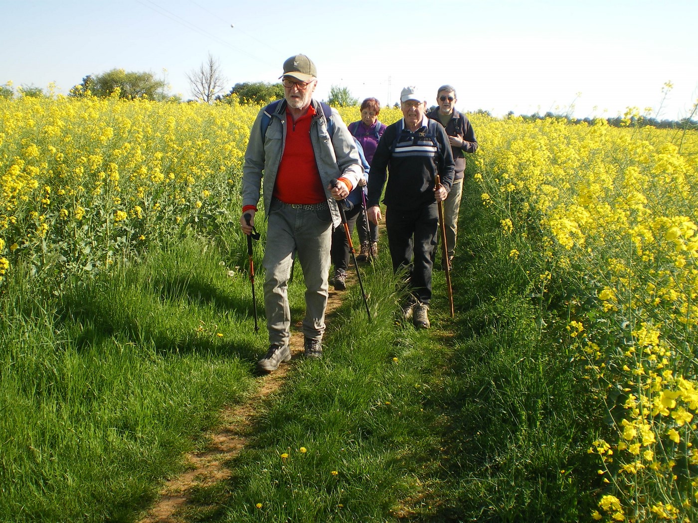 Sortie très ensoleillée parmi les champs de colza bien fleuri en espérant qu’aucun de nous ne souffrira d’allergie provoquée par cette plante . Nos passages en secteur boisé nous en auront protégés .
