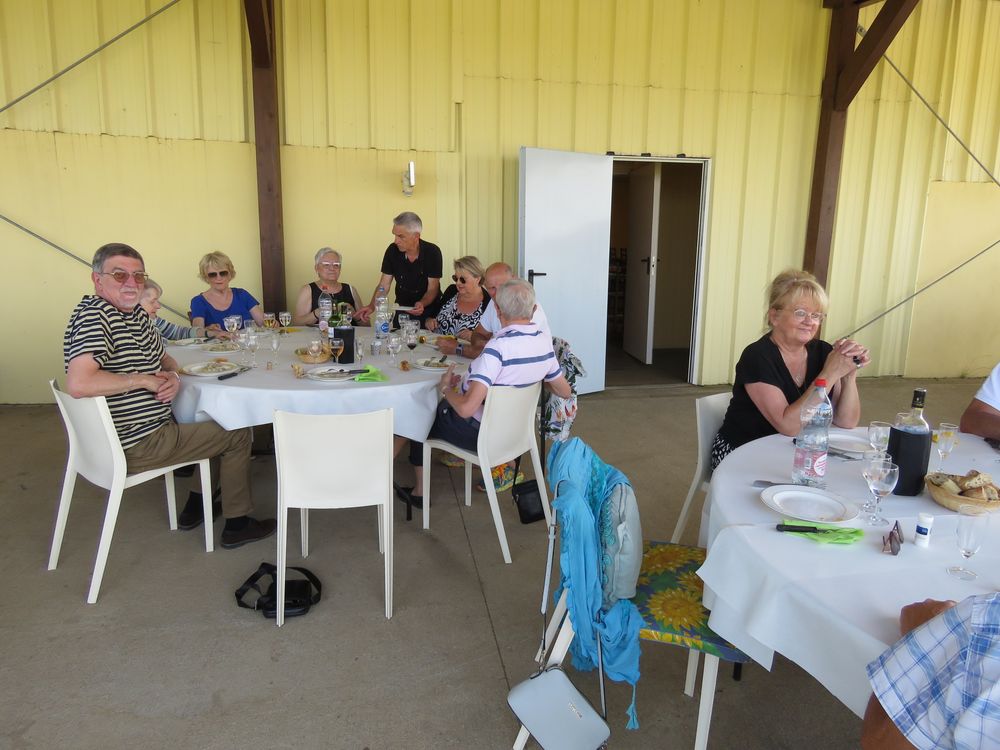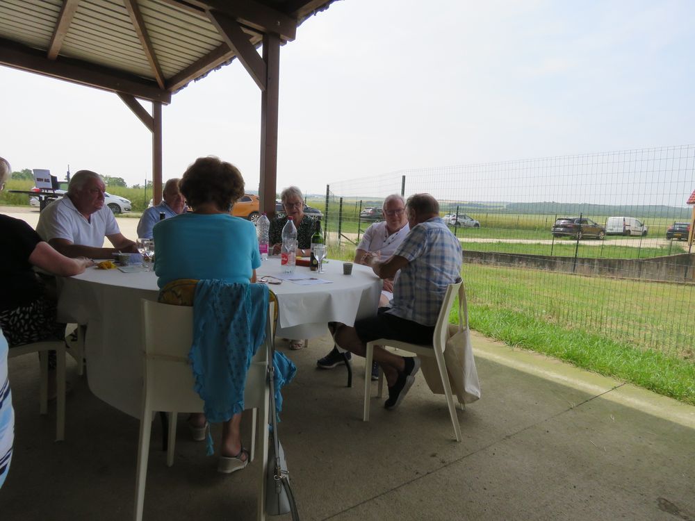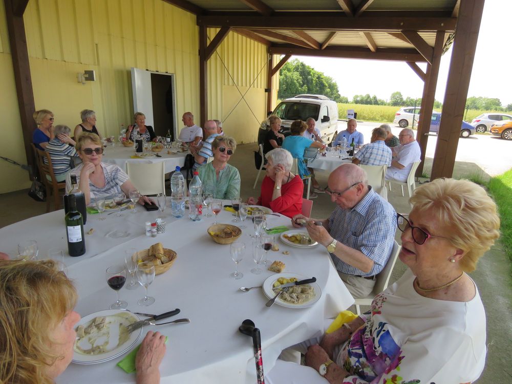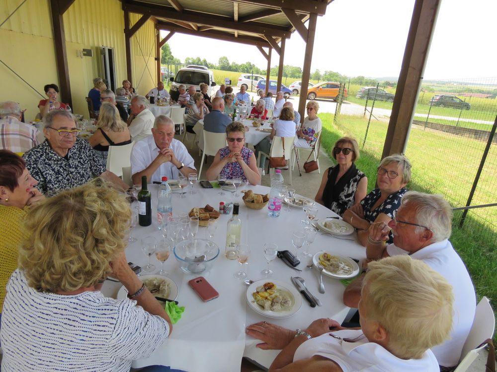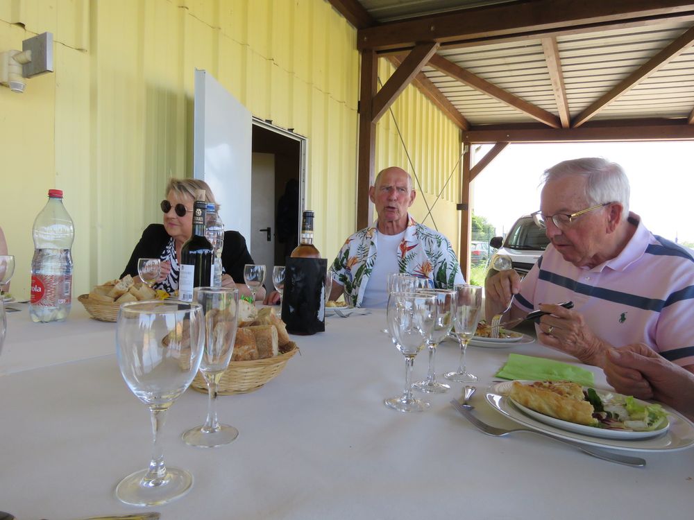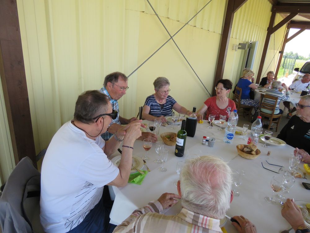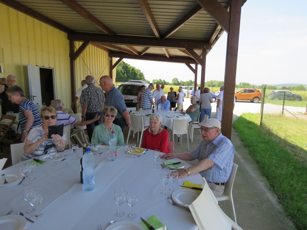 Nous avons pu déguster l'apéro à la mirabelle accompagné de toasts avec des produits locaux; puis une très bonne quiche lorraine, suivi de morceaux de porc cuisinés ; plateau de fromage et sa salade, une glace framboise en dessert, café et des chamallow dont certains se sont régalés