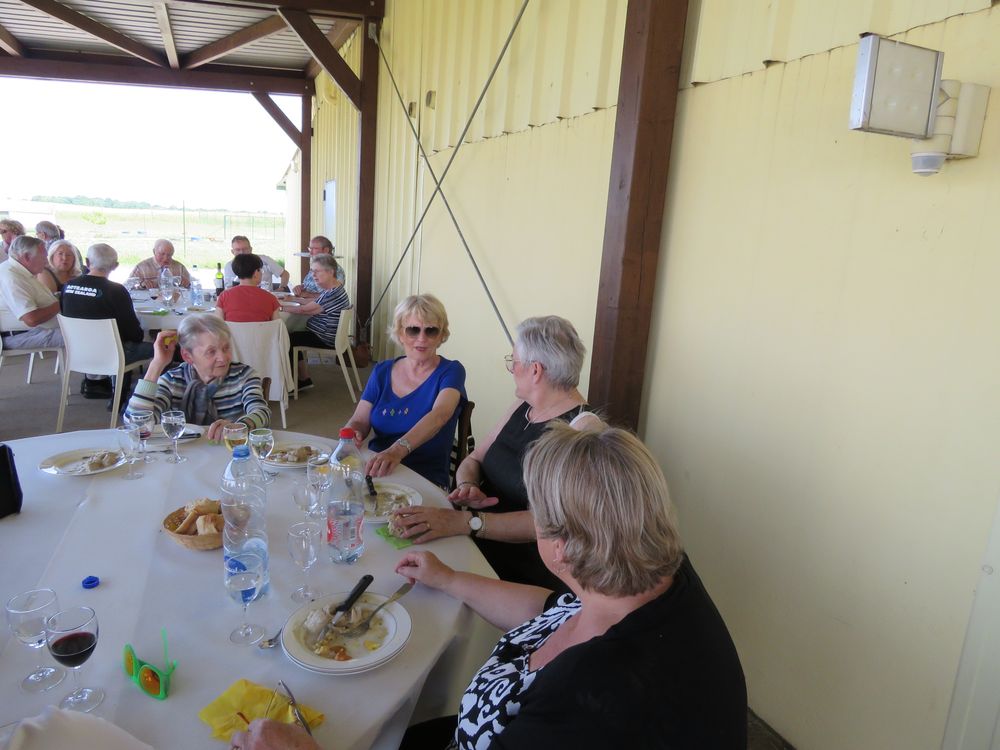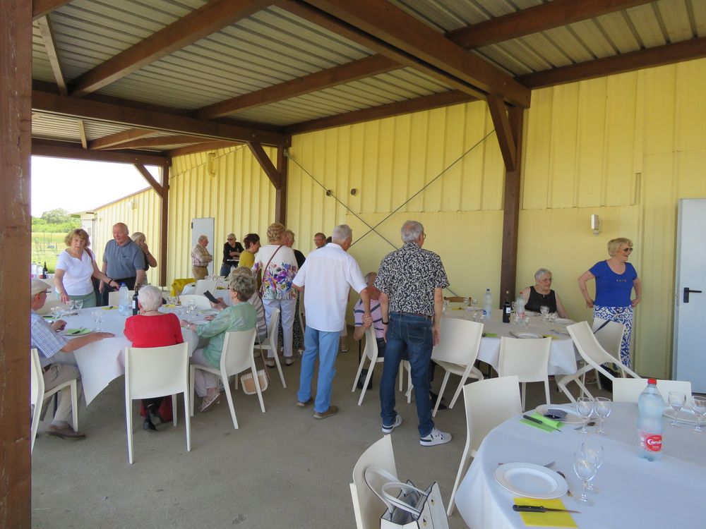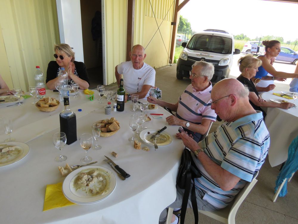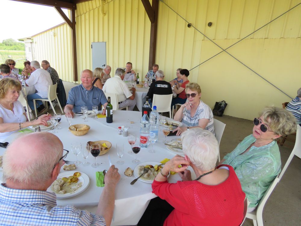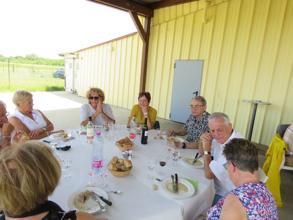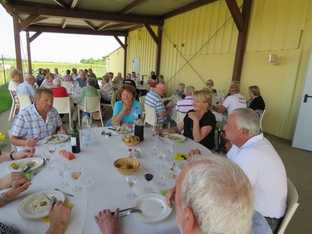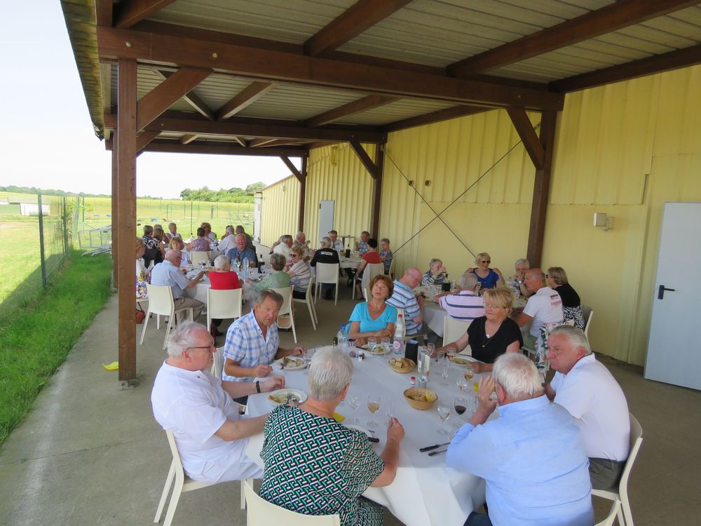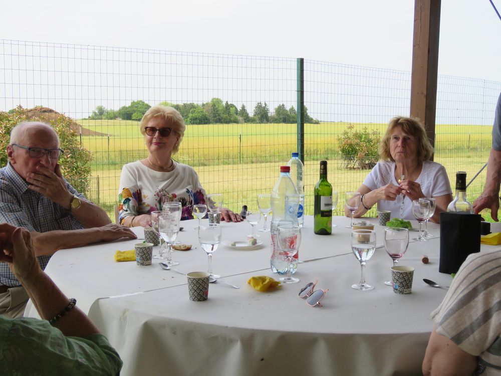 Nous avons pu déguster l'apéro à la mirabelle accompagné de toasts avec des produits locaux; puis une très bonne quiche lorraine, suivi de morceaux de porc cuisinés ; plateau de fromage et sa salade, une glace framboise en dessert, café et des chamallow dont certains se sont régalés